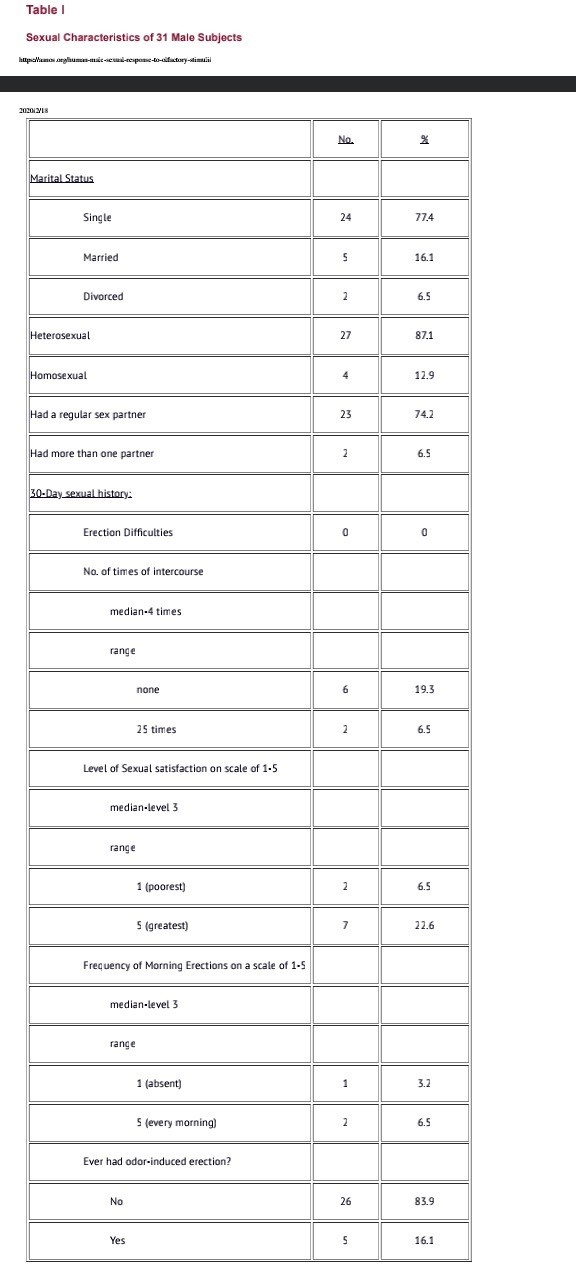 To assess their physiologic erectile function, subjects were asked to rate the frequency of their morning erections on a scale of 1 (absent) to 5 (every morning). Their median response was 3 (Table 1). Most (84%) stated that they had never experienced an odor-induced erection (Table 1).