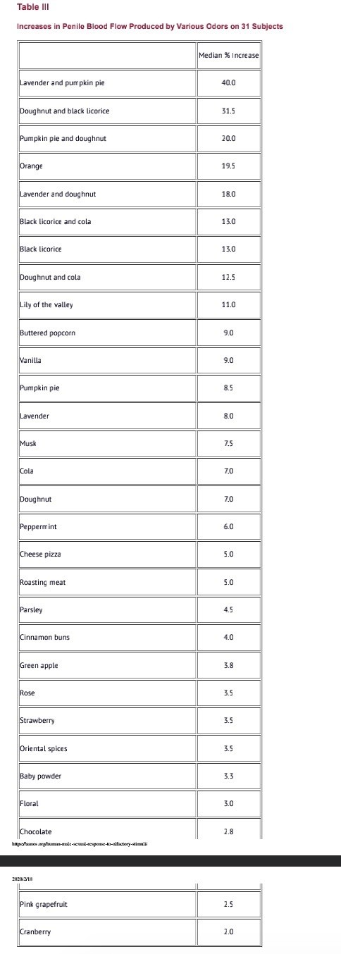 Abstract: Folk wisdom has it that various aromas are sexually enticing but no data exists demonstrating actual effects of specific odors on arousal. The