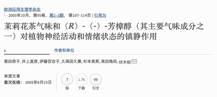 1155/2017/4517971Kuroda K等。(2005)。茉莉花茶氣味和(R)-(-)-芳樟醇(其主要氣味成分之一)對植物神經(jīng)活動和情緒狀態(tài)的鎮(zhèn)靜作用。DOI: