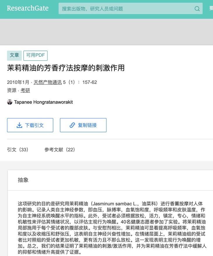 researchgate.net/publication/41576755_Stimulating_Effect_of_Aromatherapy_Massage_with_Jasmine_OilHur MH等。(2007)。香薰按摩會影響韓國更年期女性的更年期癥狀:一項由飛行員控制的臨床試驗。DOI: