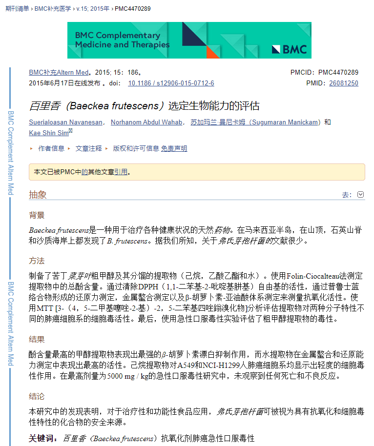 目前能夠查閱的國際資料有限,主要以中醫(yī)研究資料為主。國際資料主要以崗松的抗氧化以及細胞殺菌殺毒、抑制癌細胞、消炎等作用上的課題研究。